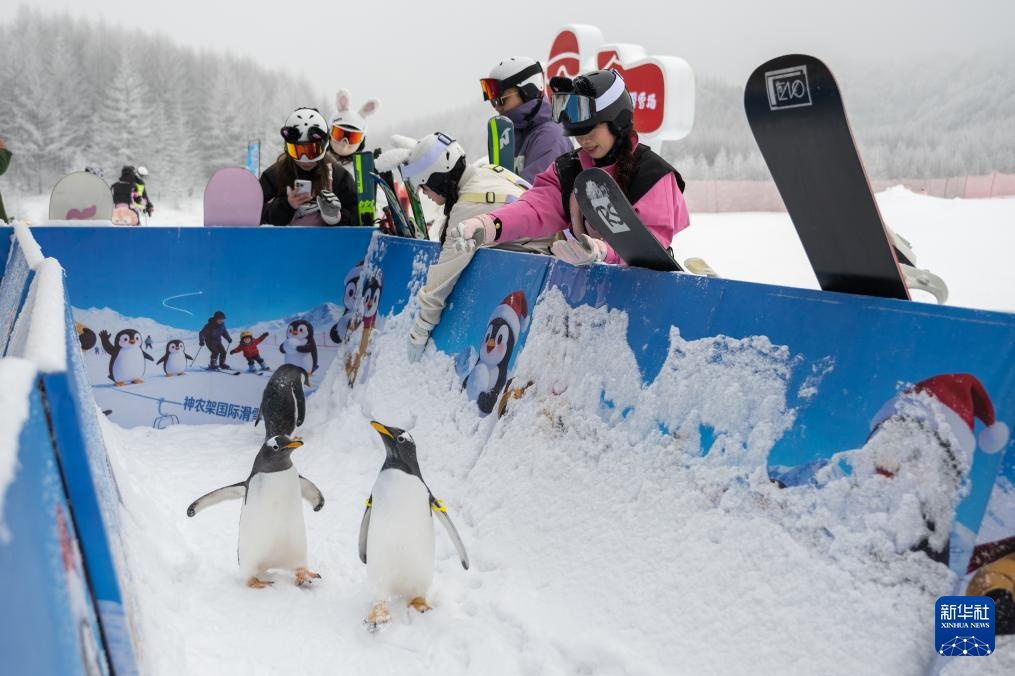 1月20日,旅客在神农架国外滑雪场与企鹅互动。新华社记者 杜子璇 摄