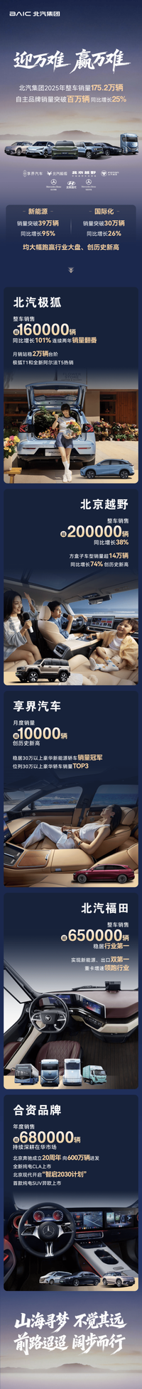 北汽福田整车销售超650000辆,稳居行业第一。结束新动力、出口双第一。合股品牌方面,年度销售超680000辆,握续深耕在华阛阓。北京当代开启“智启2030连系”。