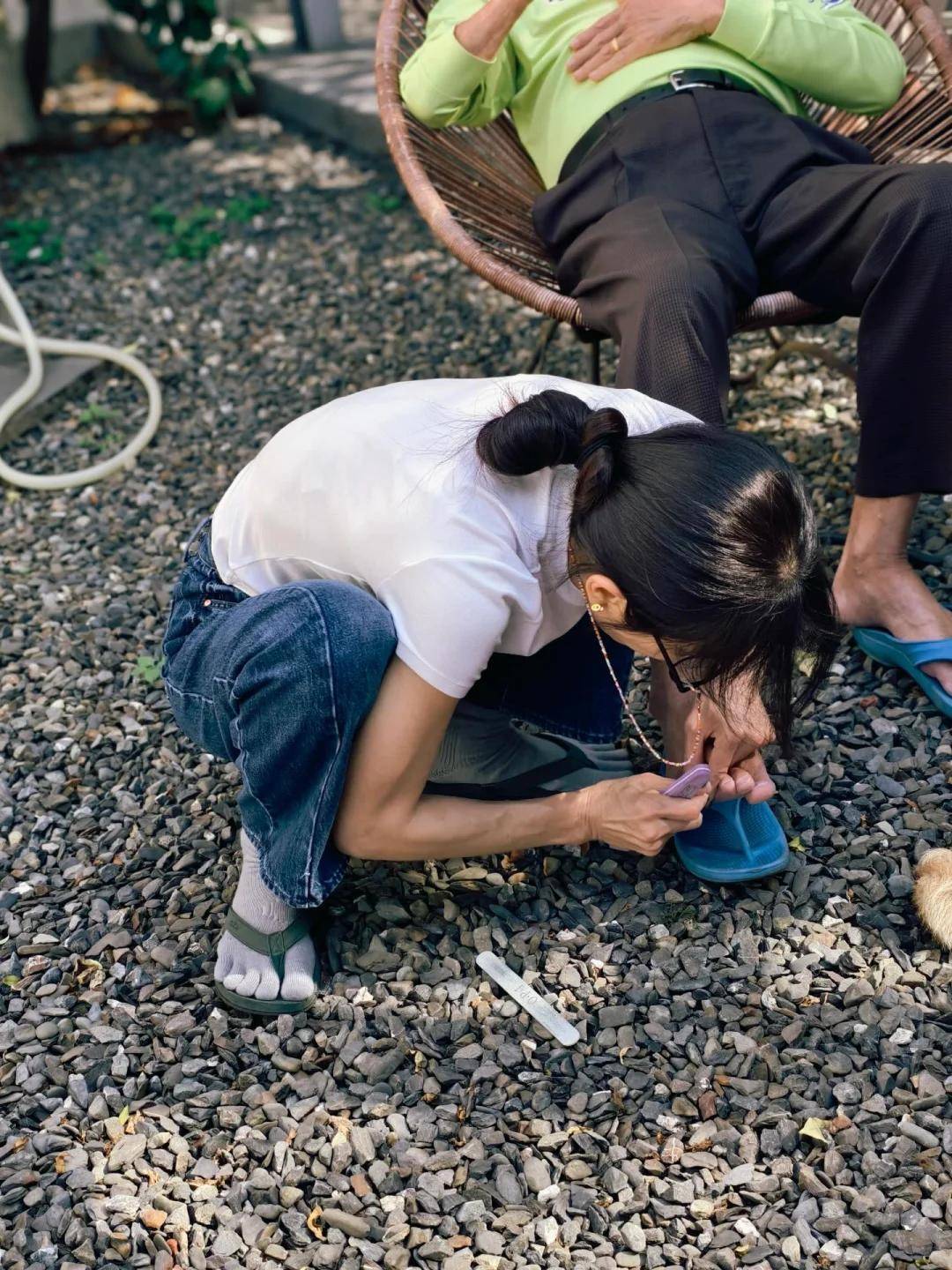 最戳东谈主的画面,是她蹲在地上,低着头小心翼翼地给父母剪脚指甲,莫得偶像背负蹲在了地上,眼睛齐快贴到父母的脚面了,一念念到她顶着老花眼还这样贴心,不仅认为有些可笑也有些感动。