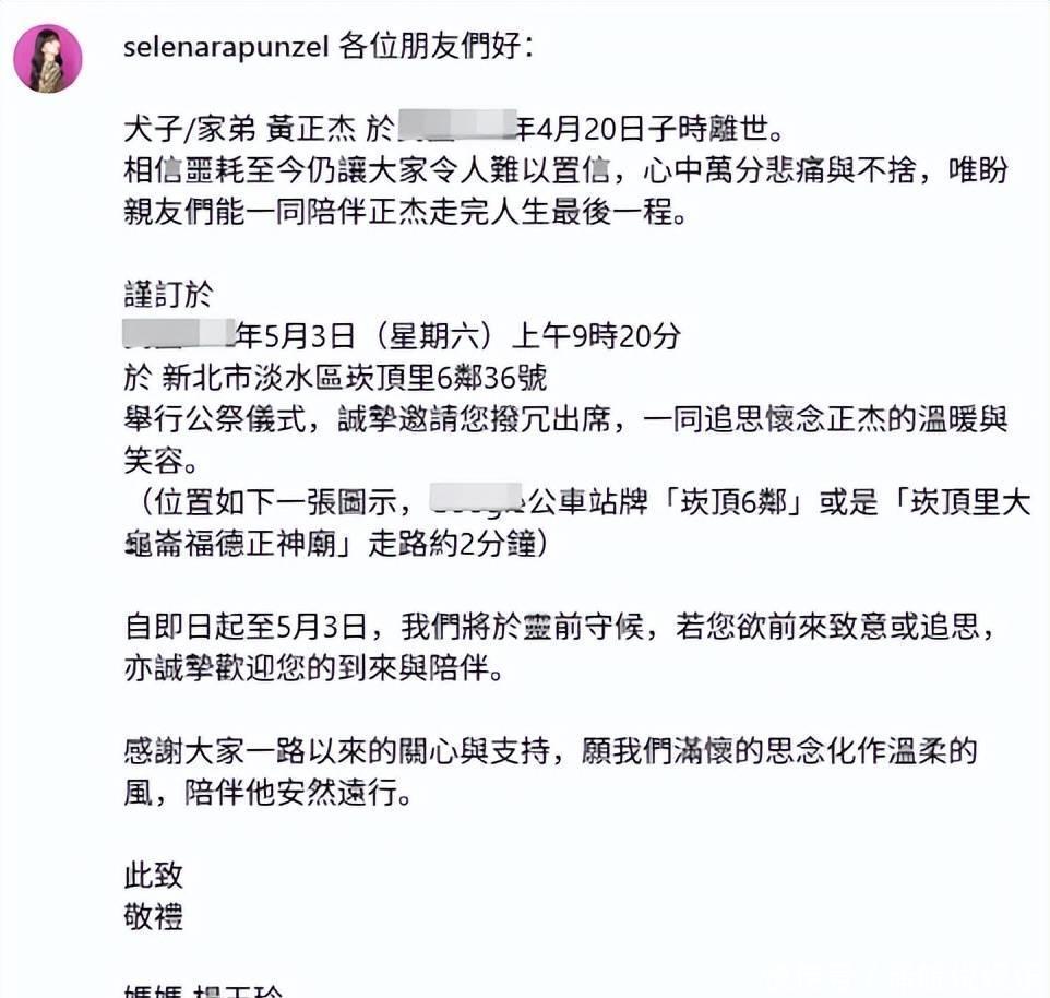 讣告中潜入,黄正杰的告别典礼在5月3日上昼举行,场合位于新北市淡水区。