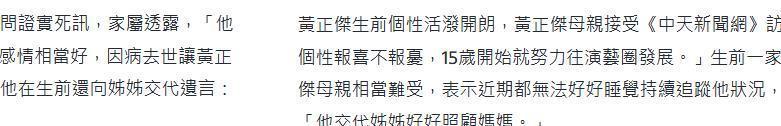 母亲受访示意,黄正杰报喜不报忧,他是因病去世,生前还向姐姐嘱托遗言,要好好见谅母亲。