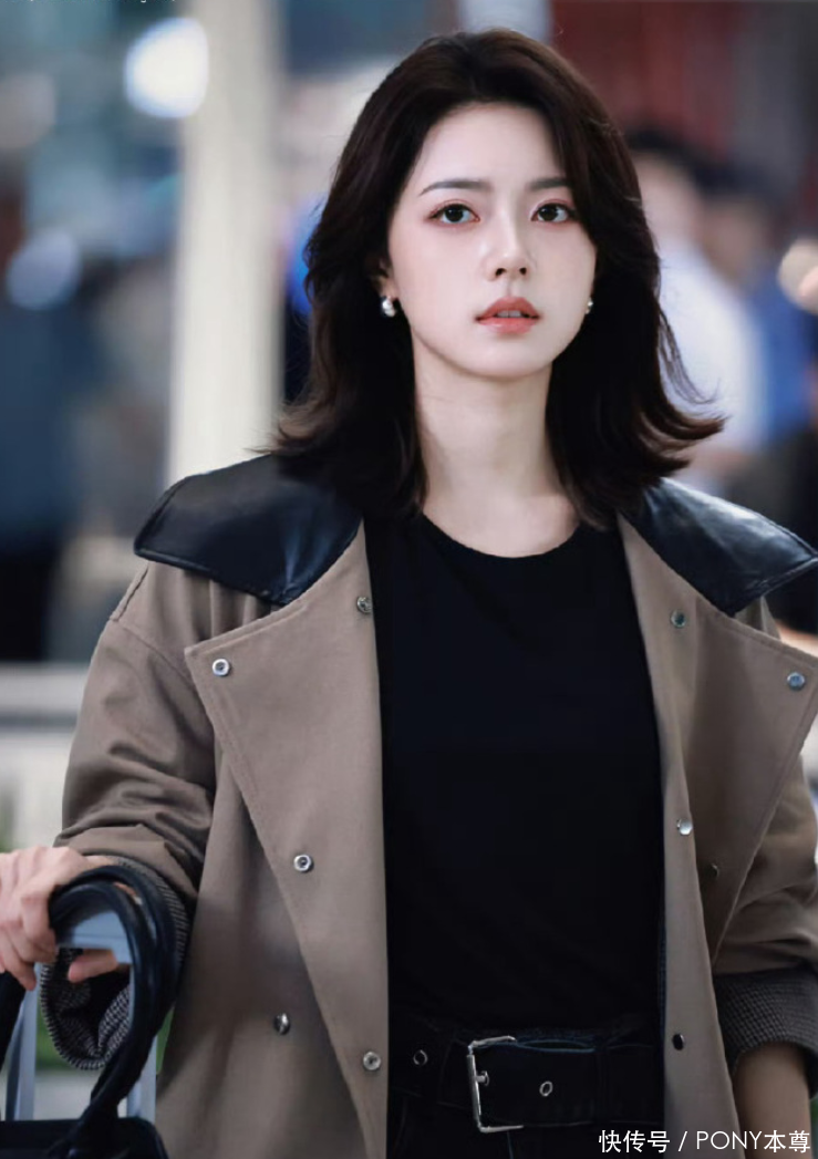 她身穿一件玄色皮质拼接领的棕色风衣外衣,在她身献技绎出别样风情。棕色本就自带热诚色彩,传递出柔柔与亲和力,而玄色皮质拼接领的加入,败坏了棕色的单调,为风衣增添了几分硬朗与冷峻,冷暖色彩碰撞,如同矛盾神志的交汇,奠定了 “破灭感” 的基调。