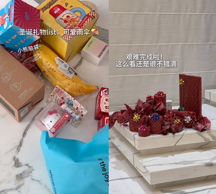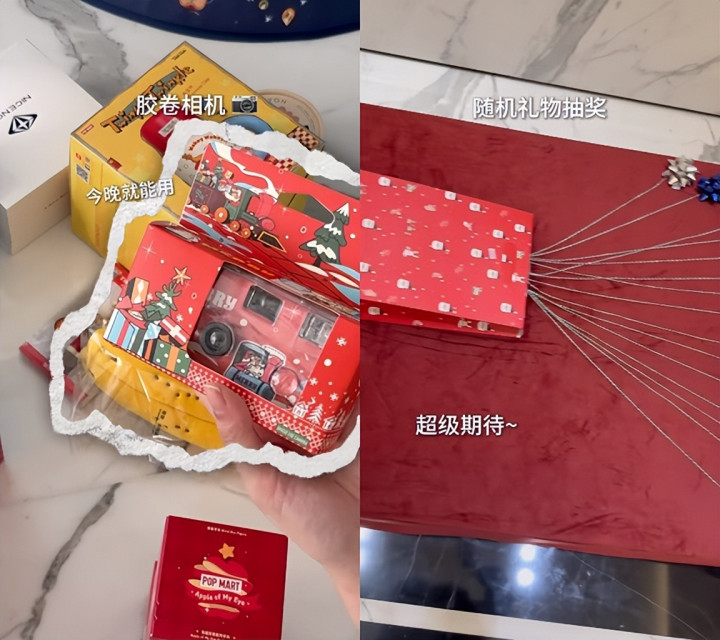 在过节之前就准备好了大颗的圣诞树,还准备了好多好玩的小礼物,用红色的纸把它们包起来,这么可以和好友们一谈交换礼物,像菲林相机、可人雨伞、kitty猫、唇膏、小熊脑袋等等,准备了一大袋就等着别东谈主拆惊喜呢!
