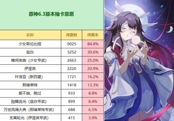 另外,备受争议的原神6.3卡池抽卡意愿也在刚刚被统计了出来,该数据来自1w多名玩家,是以仍是挺有参考性的。其中排在第一位的是84.8%的娅娅,第二位是兹白的30.9%,然后分辨是仙女的专武,伊涅芙,叶洛亚和那维莱特,策画全跳的玩家共有8.8%。